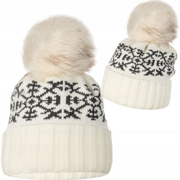 Majka Ekrü Női Téli Sapka Pomponnal Hópehely Grafit Kihajtható Majka (K14-274-UNI)ALLEGRO
