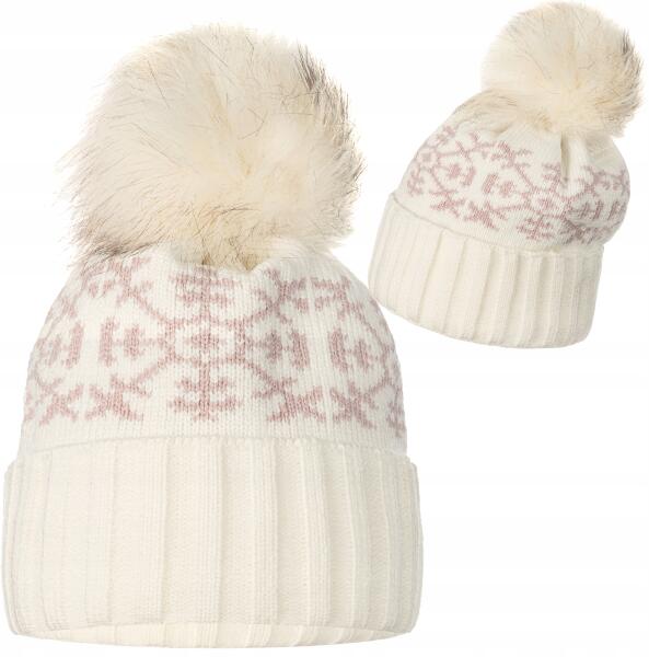 Majka Ekrü Női Téli Sapka Pomponnal Rózsaszín Hópehely Kihajtható Majka (K14-262-UNI)ALLEGRO