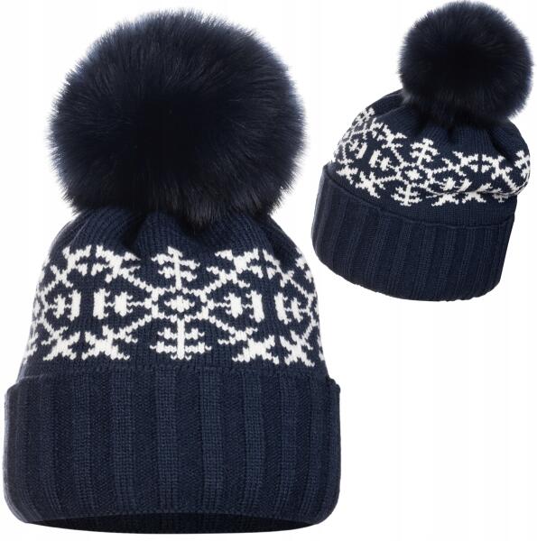 Majka Sötétkék Női Téli Sapka Pomponnal Bézs Hópehely Mintás (K14)ALLEGRO