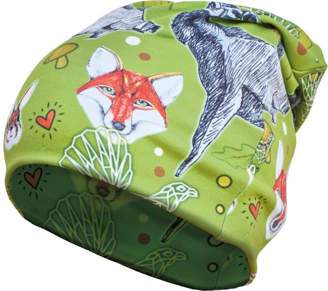 Kellemes és aranyos kétoldalas sapka erdei állatnyomattal, amelybe beleszeret. A sapka kényelmes a viselete és nagyon meleg.