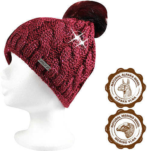 - női kötött sapka merinó gyapjúból és alpaka gyapjúból (dél-amerikai teve szőréből), flitterekkel díszítve, belül mikrogyapjúval.
