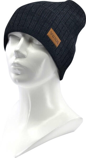 - téli kötött sapka férfiaknak, bordázott elegáns megjelenéssel, luxus VoXX® bőrfoltokkal kiegészítve.